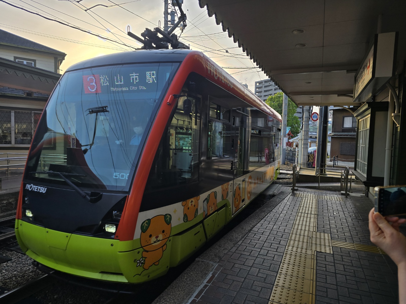 체크인을 마친 후 마쓰야마의 상징이자 교통수단인 **노면전차(이요철도)**를 타고 도고온천역으로 이동했습니다. 노면전차가 신호등을 지키는 모습이 이색적이었어요. 도고온천역까지는 약 15분 정도 소요되었는데, 작은 도시임에도 매력적인 '이동' 경험을 선사해주었습니다.