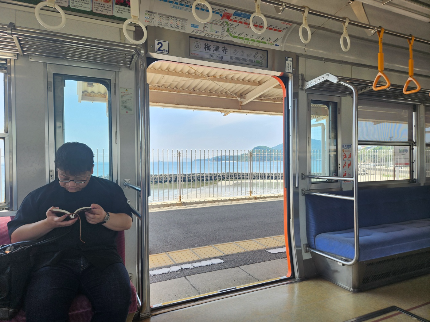 열차는 여전히 조용하고 깨끗했다. 창밖으로는 마쓰야마의 낮은 건물과 조금씩 보이기 시작하는 바다가 스쳐 지나갔다. 짧지만 여유로운 전철 이동이 끝나고 다카하마역에 도착했다.